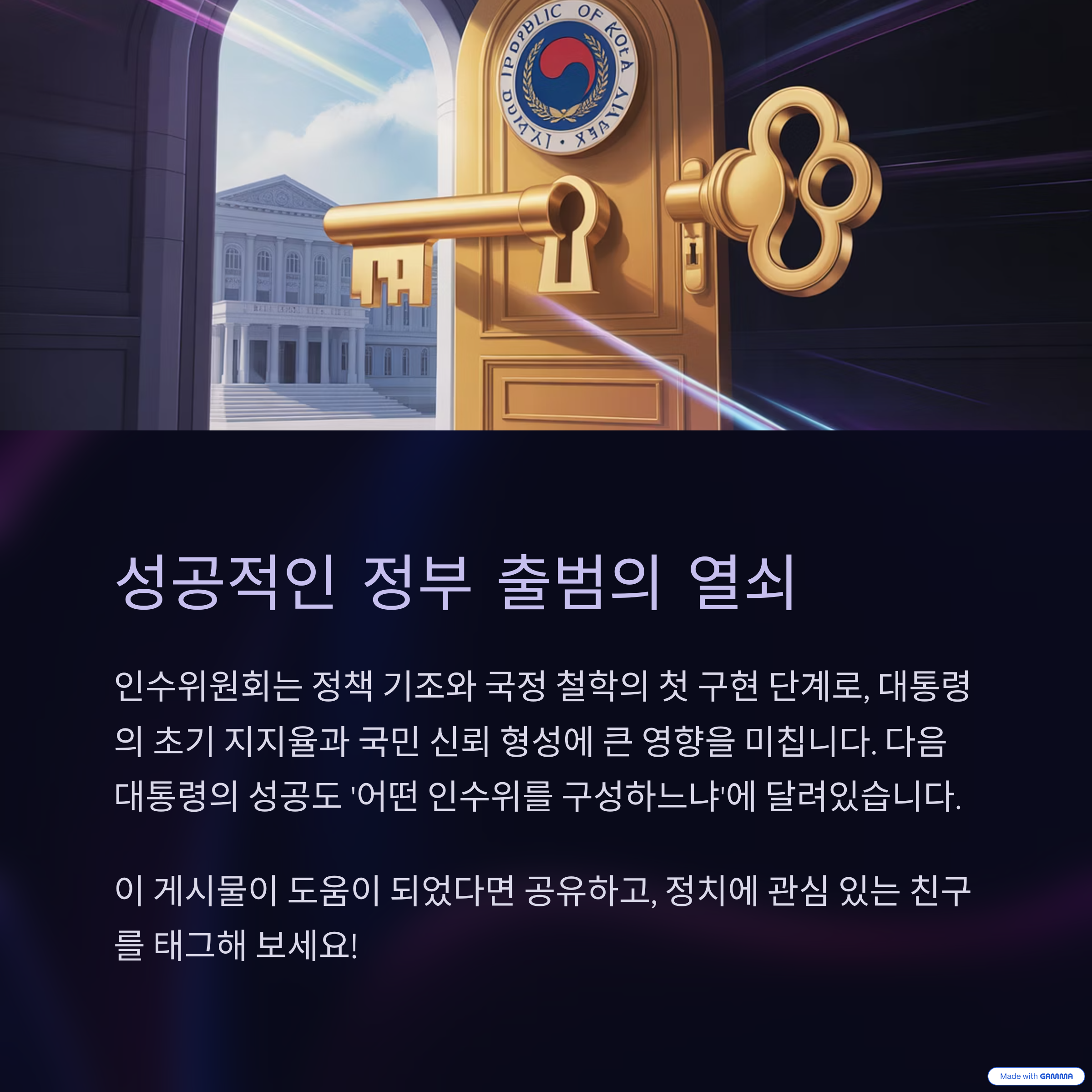 새로운 리더십은 선거가 아니라 인수위에서 시작된다는 말, 이제 좀 와닿지 않으세요? 준비된 대통령은 당선과 동시에 ‘실행력 있는 시작’을 보여줍니다. 앞으로의 선거에서도 우리는 단순히 공약이 아니라 ‘그 사람이 어떻게 준비하느냐’를 함께 보게 될 거예요. 여러분도 다음 대통령의 인수위 활동, 꼭 관심 가져보세요. 미래는 준비된 자에게 열린다고 하잖아요?
