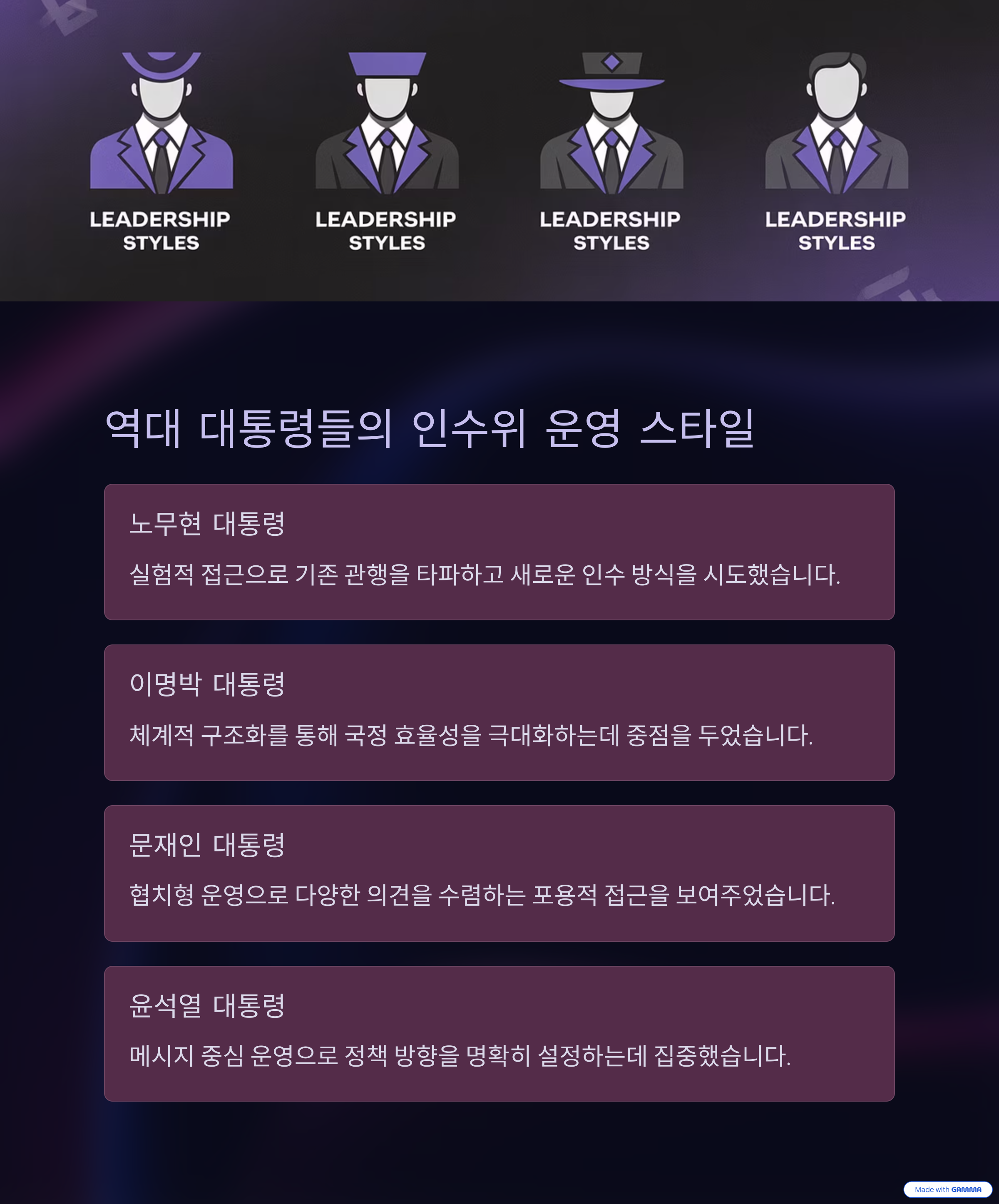• 노무현: 수평적 구조를 지향했지만 초기 혼란 발생