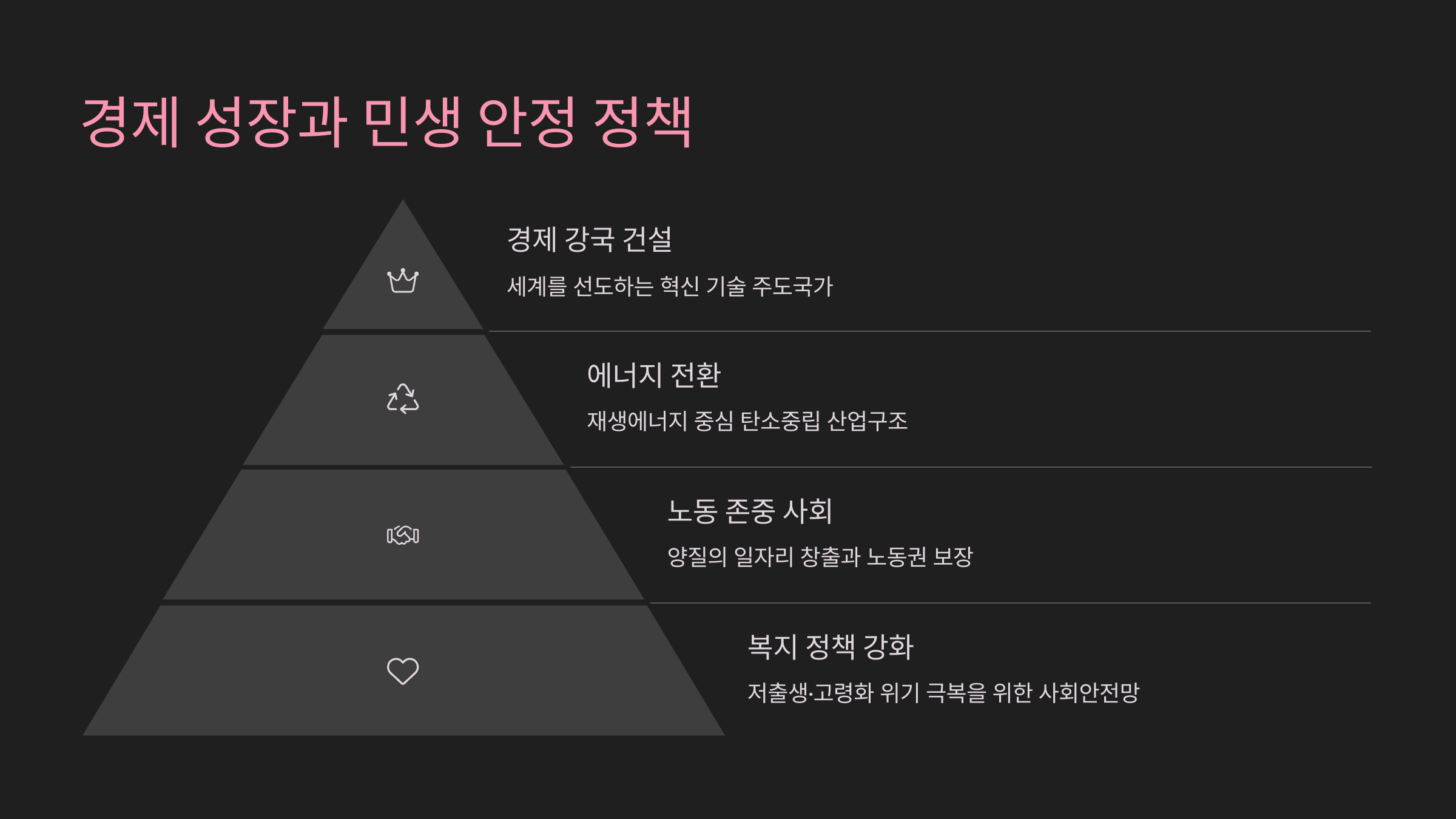 | 친환경 경제 전환 | 재생 에너지 확대 및 탄소 감축 | 지속 가능한 성장, 환경 보호 |