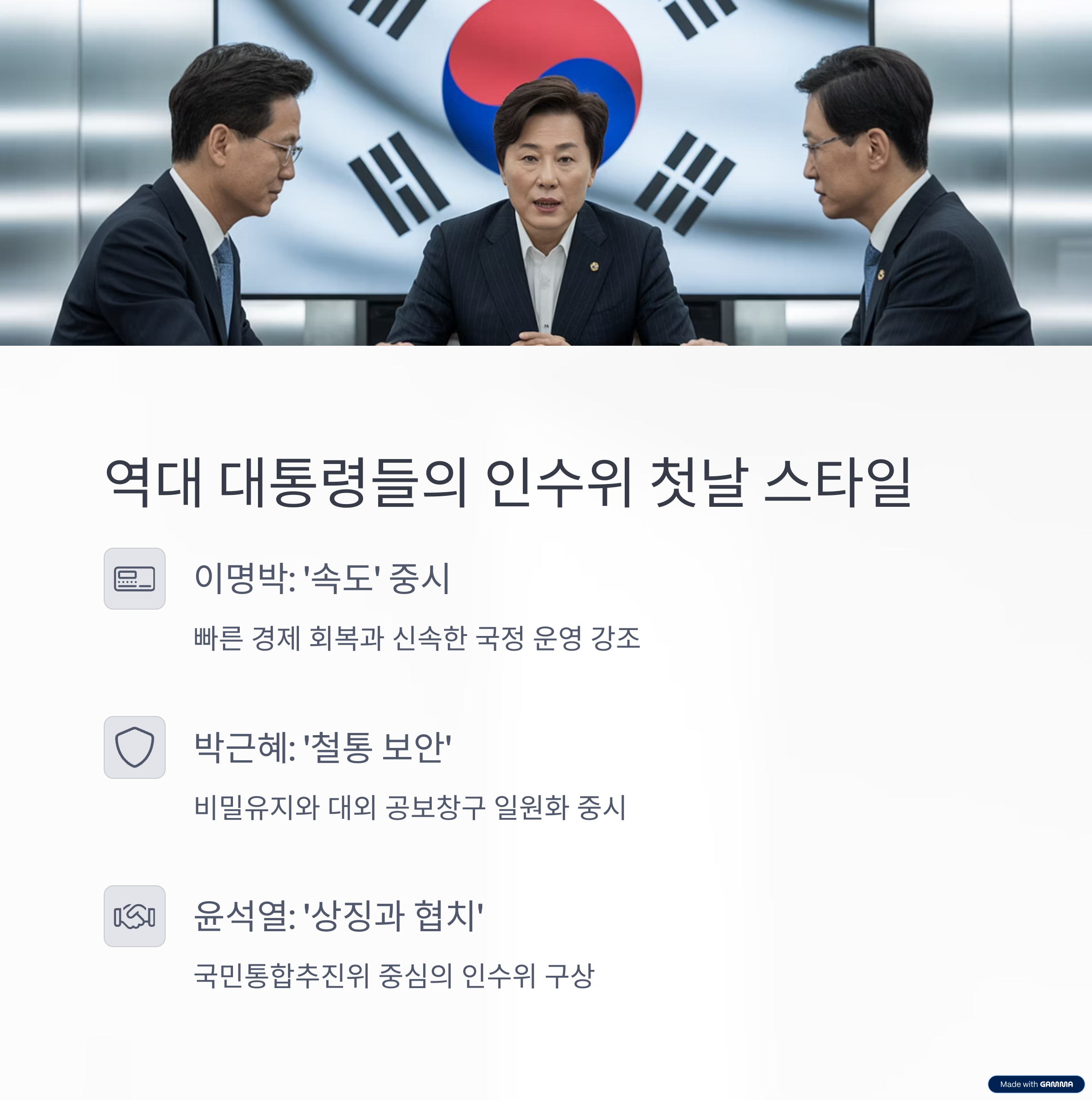 각 대통령이 인수위 첫날 무엇을 우선했는지 비교해 보면, 준비된 대통령과 급박했던 상황이 확연히 갈려요.