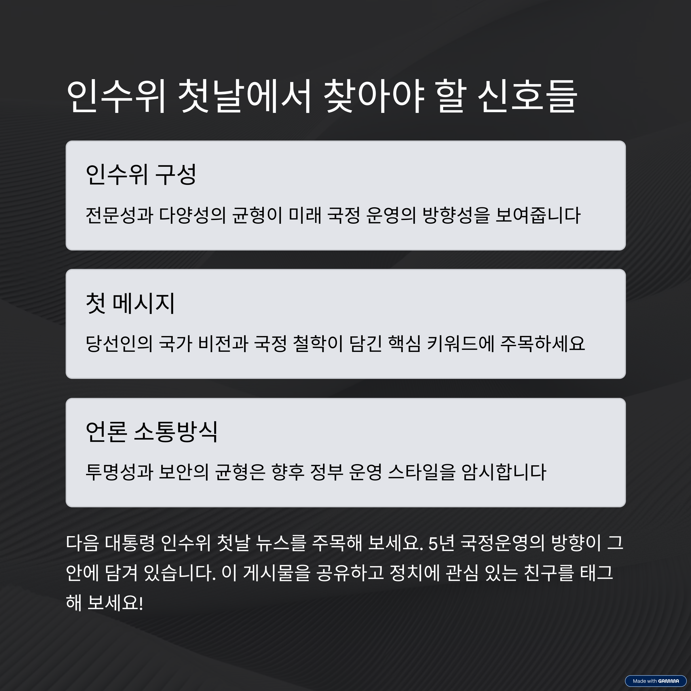 대통령직 인수위의 첫날은 그저 조직만 꾸리는 날이 아니에요. 국정 철학의 방향성과 리더십 스타일이 고스란히 드러나는 출발점입니다. 인사, 조직구조, 회의 방식, 첫 메시지까지 모두 언론과 국민의 집중 조명을 받는 하루죠. 말 그대로 '정권의 첫 발자국'이라 할 수 있어요.