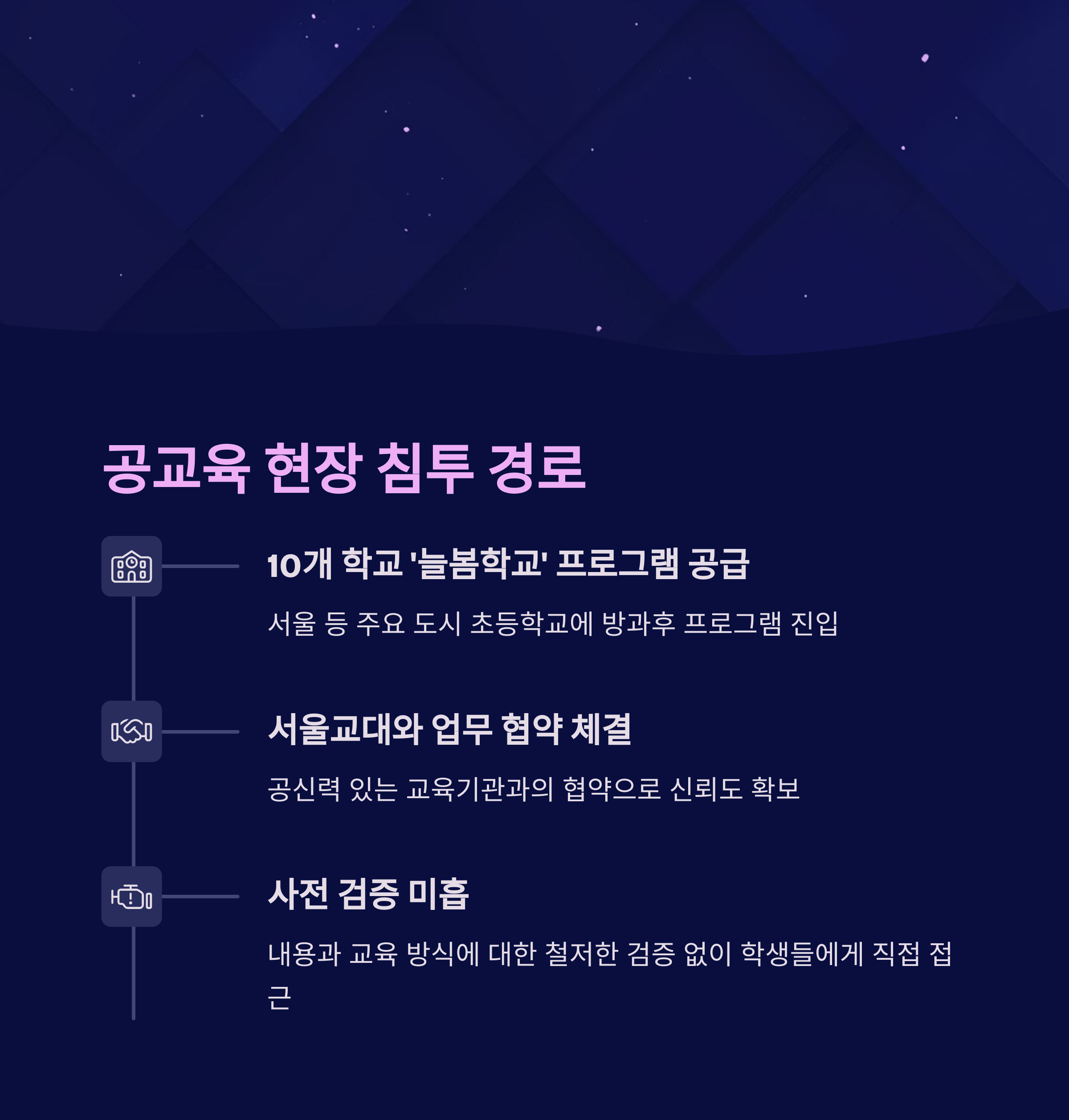 리박스쿨은 윤석열 정부의 대표 교육정책인 ‘늘봄학교’ 프로그램에 진입해, 서울 지역 초등학교 방과후 수업에 강사와 프로그램을 공급했습니다. 과학·예술 프로그램이라고 포장했지만, 실제로는 특정 정치 성향과 역사관이 교육내용에 포함돼 있었던 것이죠.