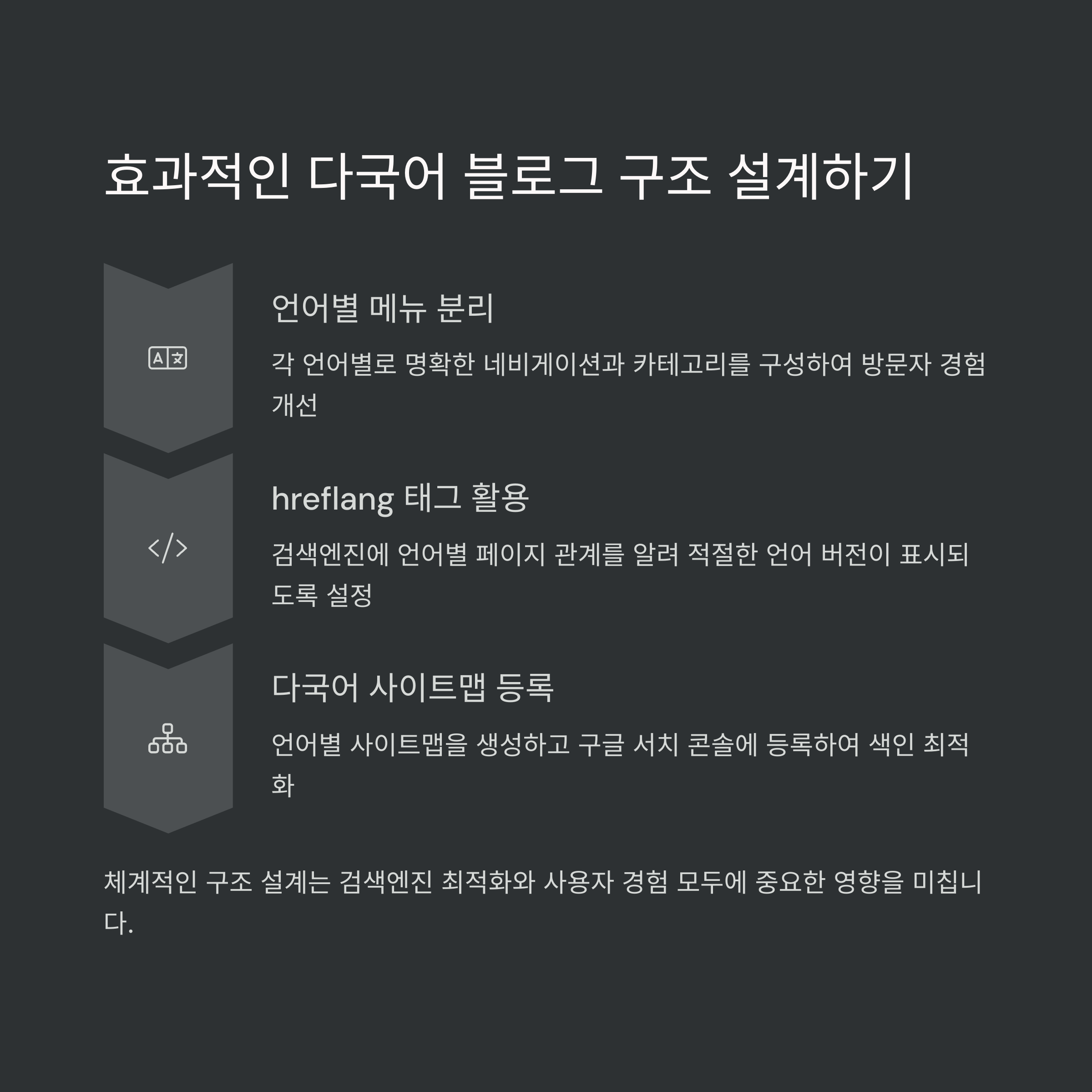 각 언어별로 최적화된 표현과 자연스러운 문장을 사용하고, 페이지 이동이 편리하도록 구조를 설계하세요. 방문자가 언어 선택부터 콘텐츠 소비까지 불편함 없이 이어지도록 만드는 것이 핵심입니다.