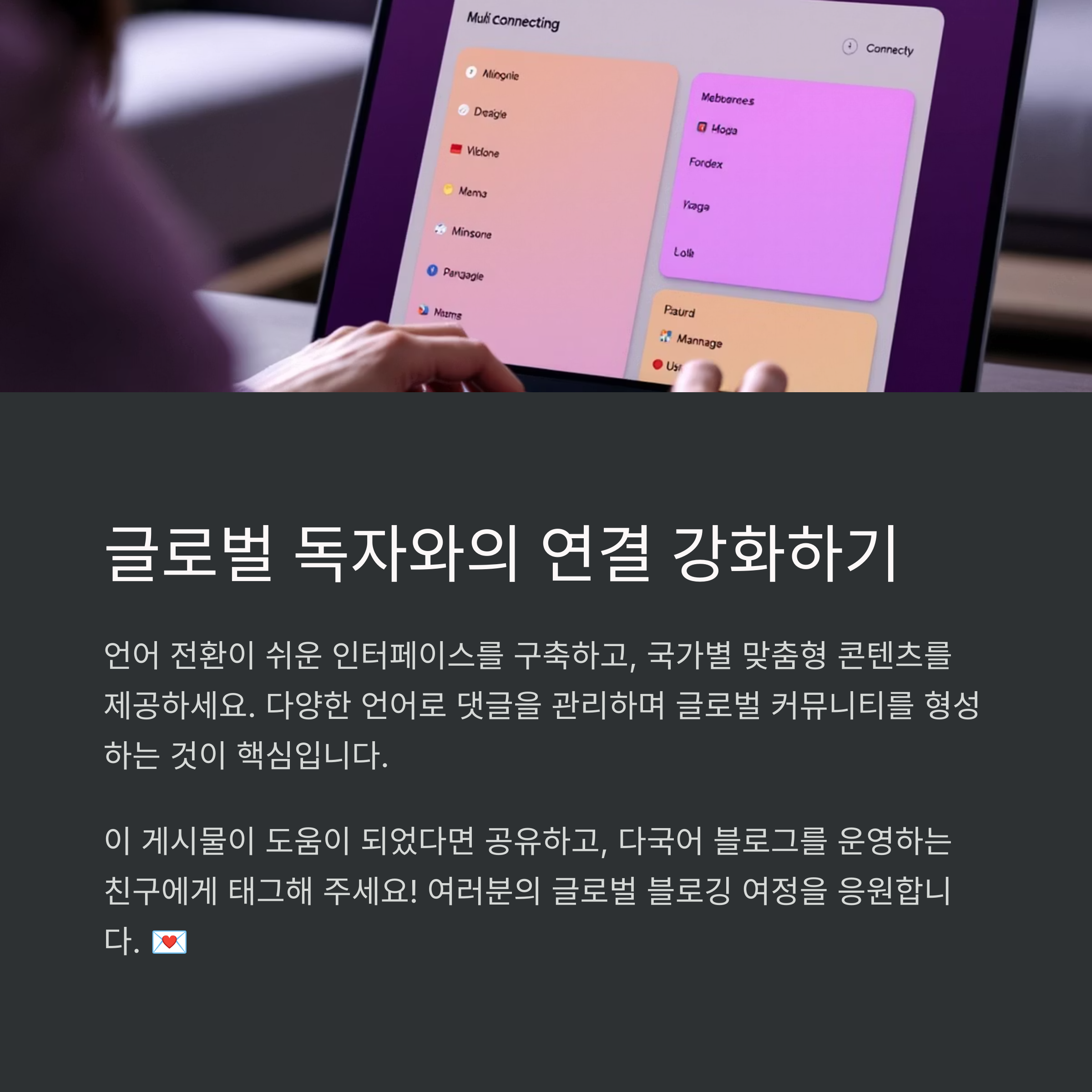 중요한 포스트부터 DeepL, Google 번역 등을 이용해 다른 언어로 번역한 버전을 작성하세요. 같은 포스트를 언어별로 복제해 운영하거나 하나의 포스트 안에 다국어를 함께 제공할 수도 있습니다.