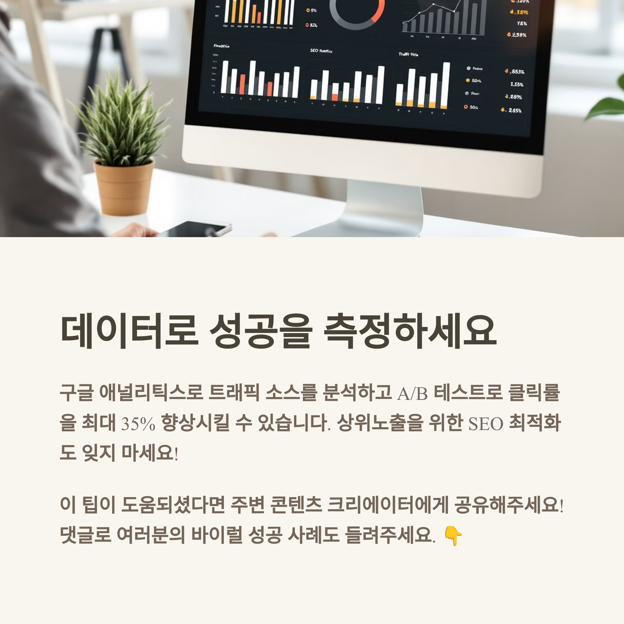 바이럴은 한 번의 시도로 끝나지 않습니다. 구글 애널리틱스와 서치 콘솔로 반응을 분석하고, 어떤 콘텐츠가 잘 먹히는지 확인한 뒤 제목, 썸네일, 본문을 계속 개선해 나가세요.