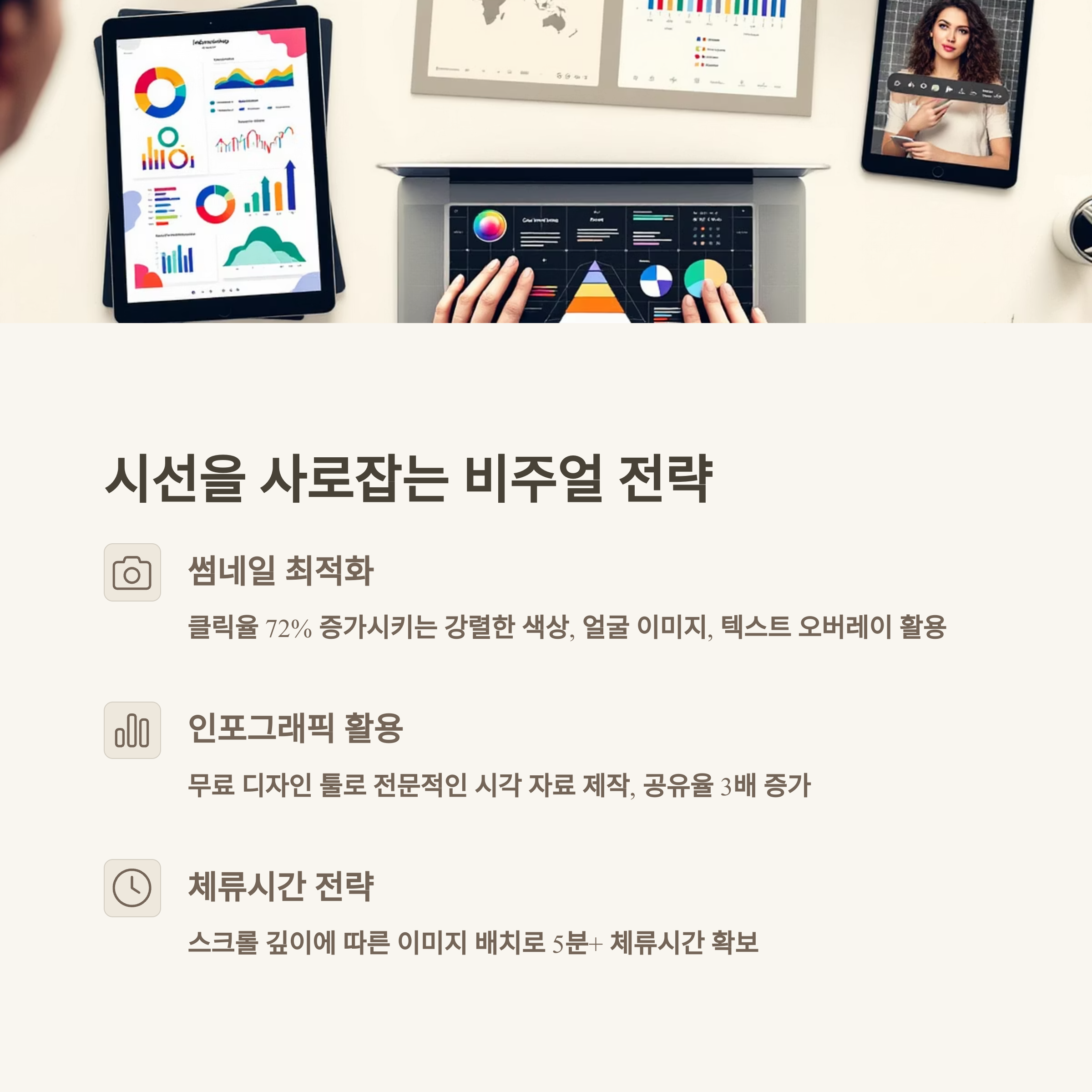 텍스트만으로는 바이럴이 어렵습니다. 고퀄리티 이미지, 인포그래픽, 짧은 영상 클립을 삽입하세요. 특히 핀터레스트 스타일의 긴 세로형 이미지는 SNS 공유에 유리합니다.