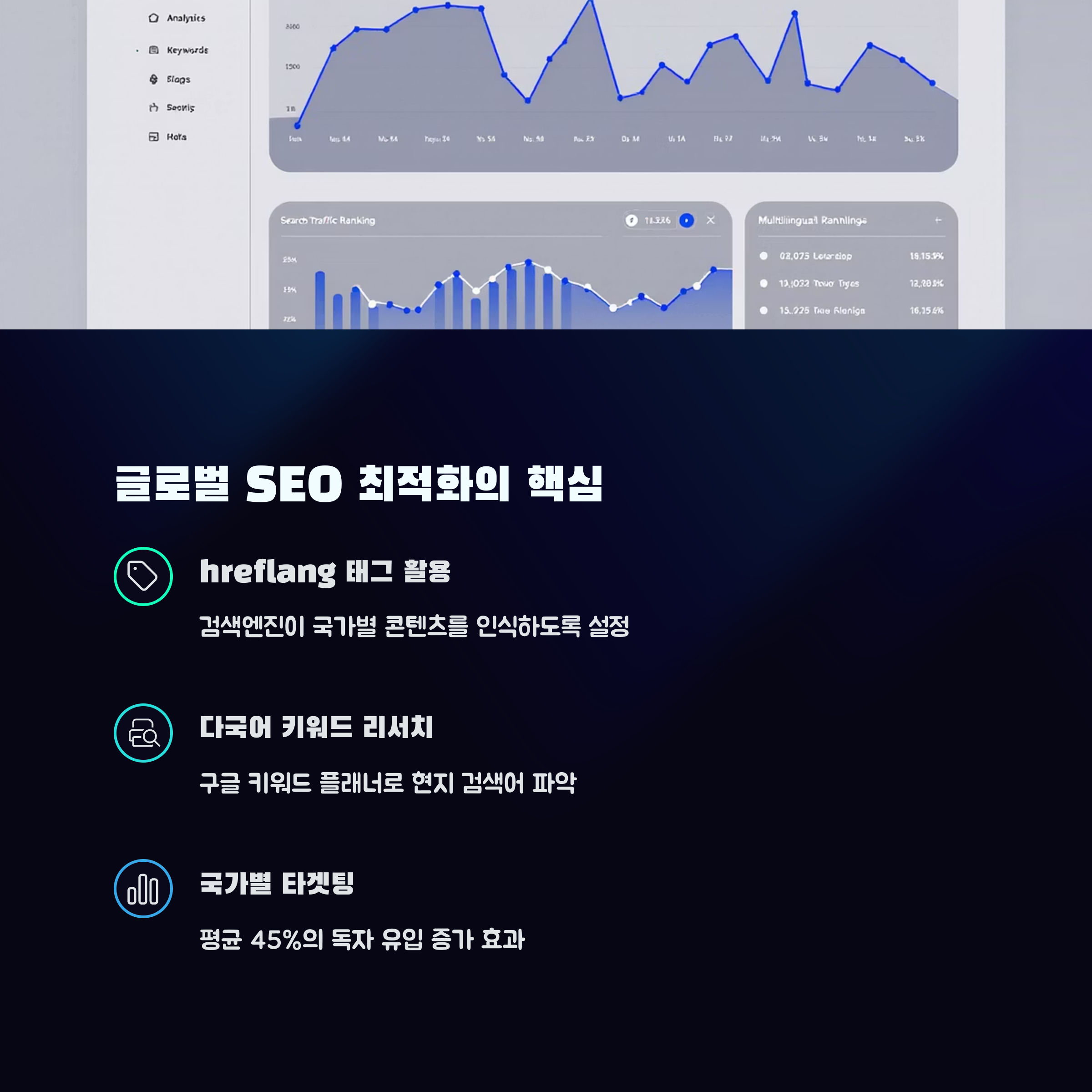 글로벌 시장에서는 다국어 SEO 최적화가 필수입니다. hreflang 태그를 활용하고, 각 언어 버전마다 메타태그, 제목, 설명을 최적화해야 검색 노출을 극대화할 수 있습니다.