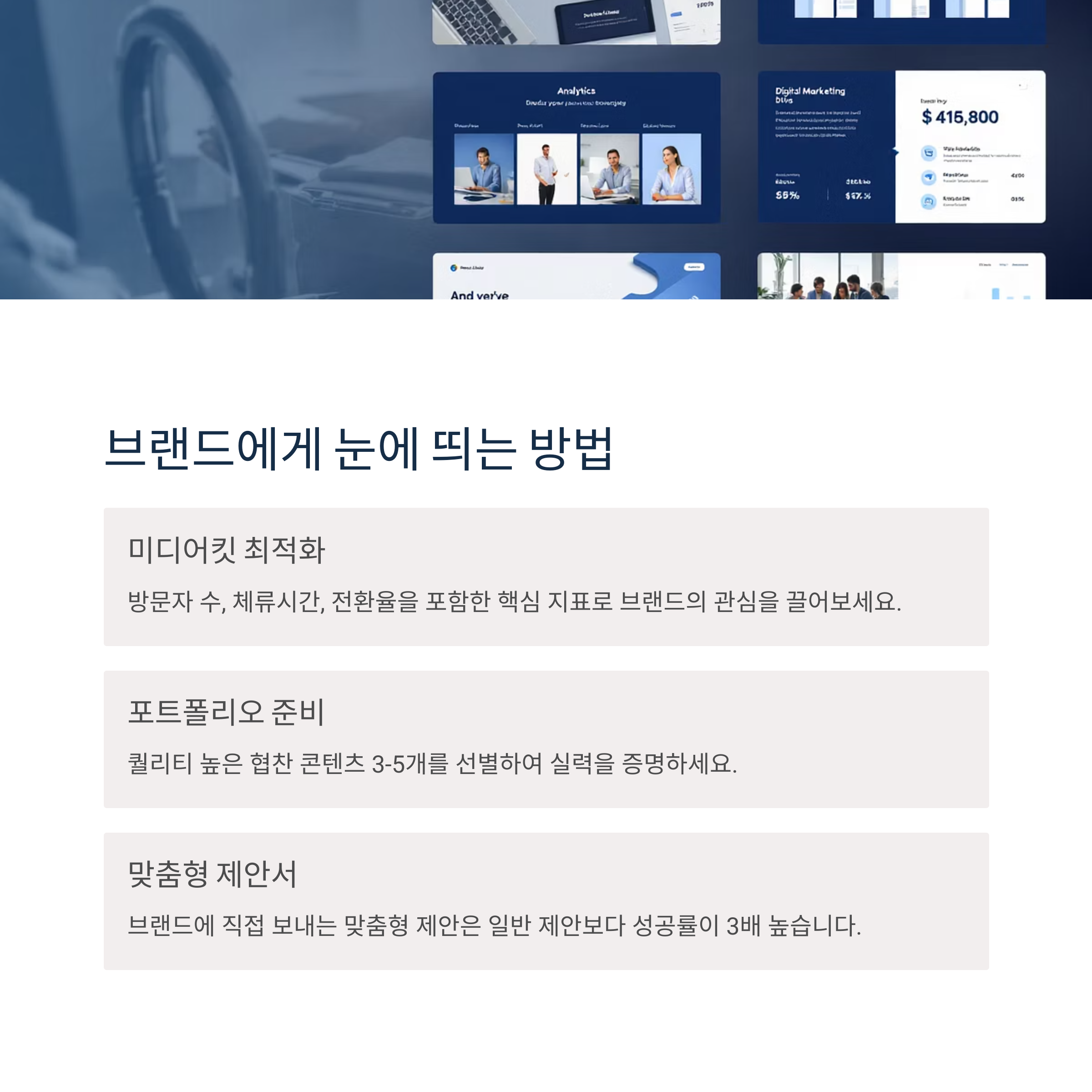 자신의 블로그 트래픽, 구독자 수, 콘텐츠 예시를 포함한 미디어킷을 제작해 브랜드에 직접 제안 메일을 보내세요. 제안서는 간결하고 핵심을 담아야 효과적입니다.