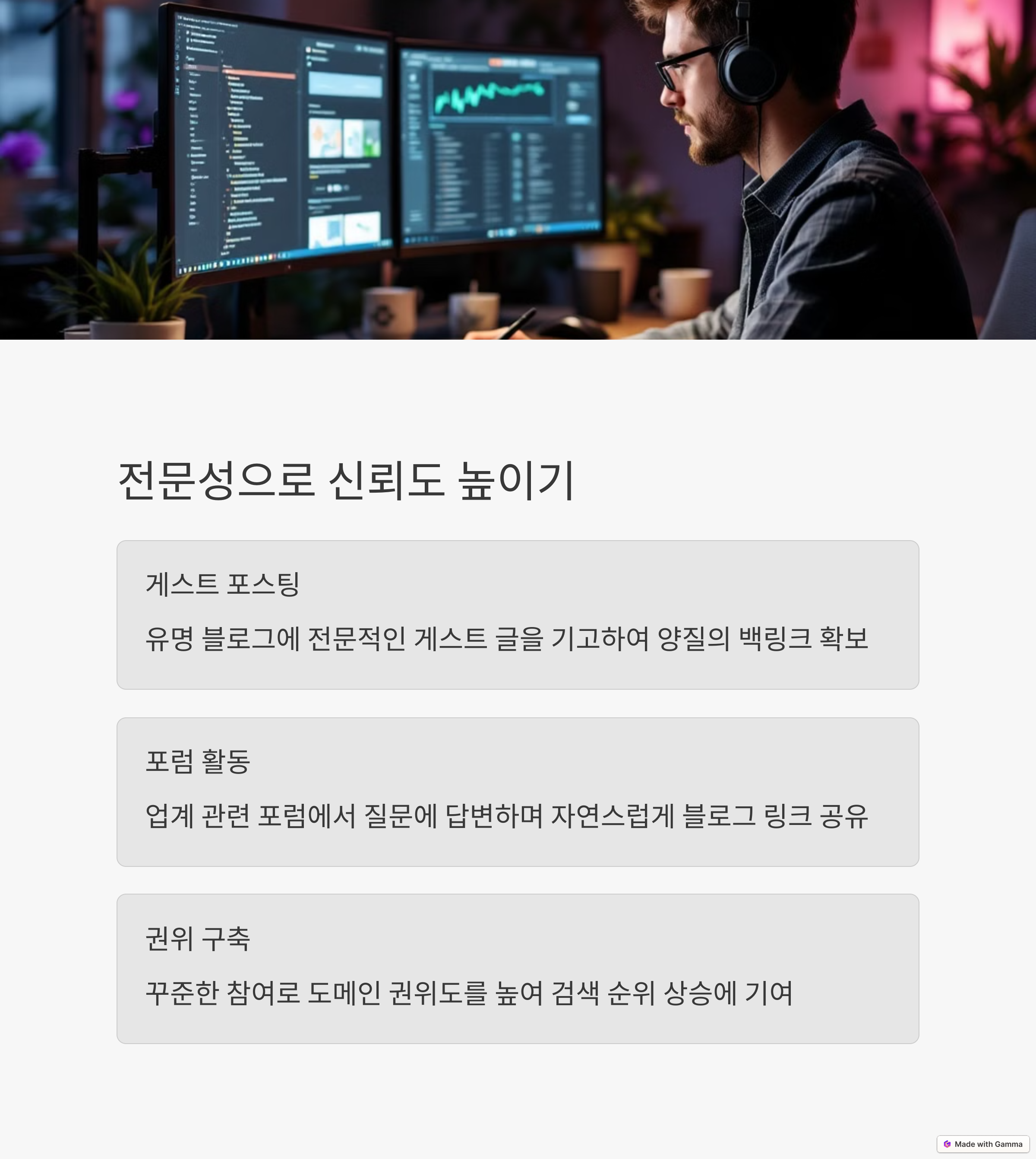 네이버 카페, 온라인 포럼, 디스커스 등 커뮤니티에서 전문적인 조언을 하며 링크를 남기면 자연스러운 백링크가 생성됩니다. 특히 질문에 대한 명쾌한 답변은 클릭을 유도할 수 있습니다.