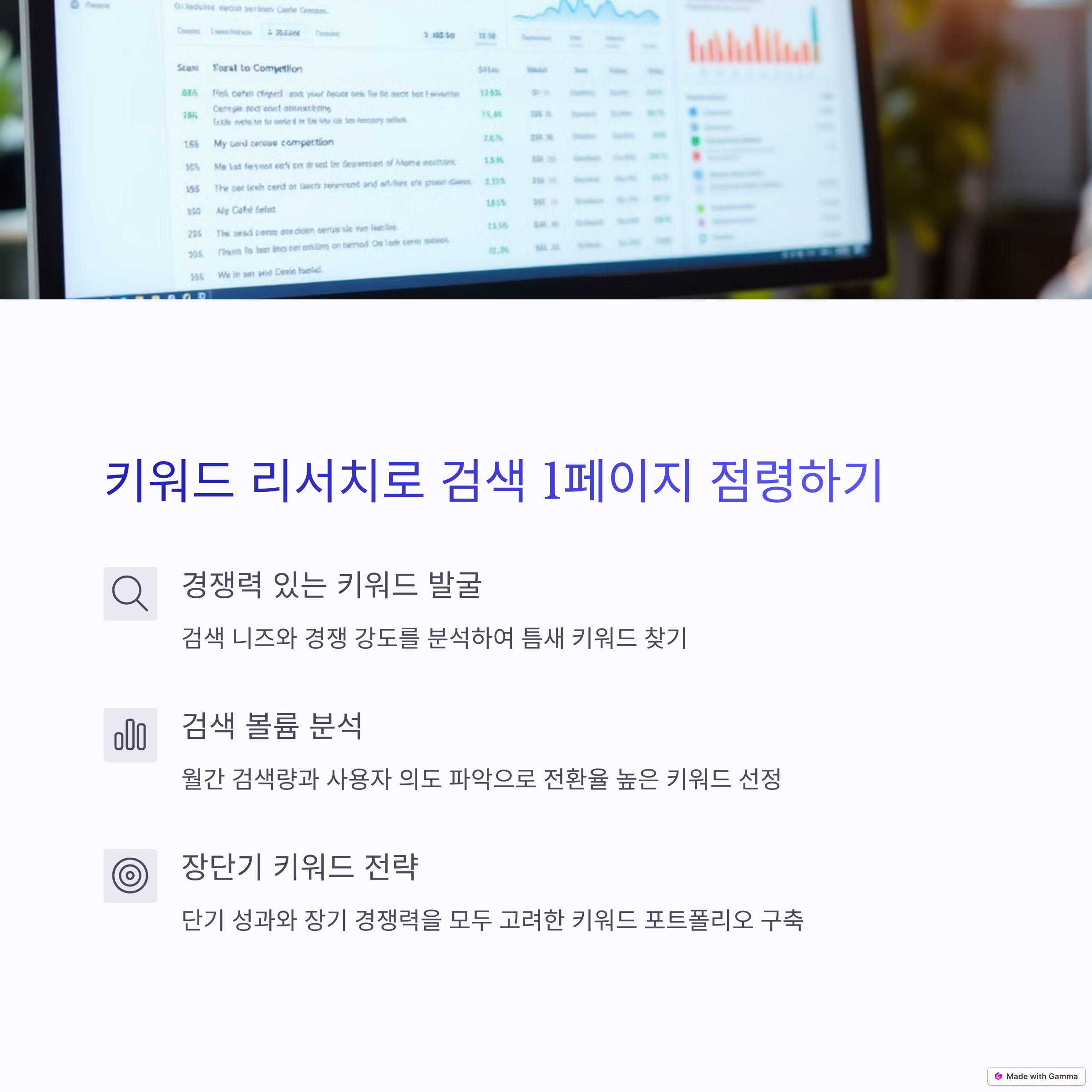 키워드 리서치는 타겟 독자가 무엇을 검색하는지를 이해하는 데 필수입니다. Google 키워드 플래너, 네이버 키워드 도구, Ubersuggest 등을 활용하여 검색량과 경쟁도를 확인하고, 블로그 주제에 맞는 키워드를 선별하세요.