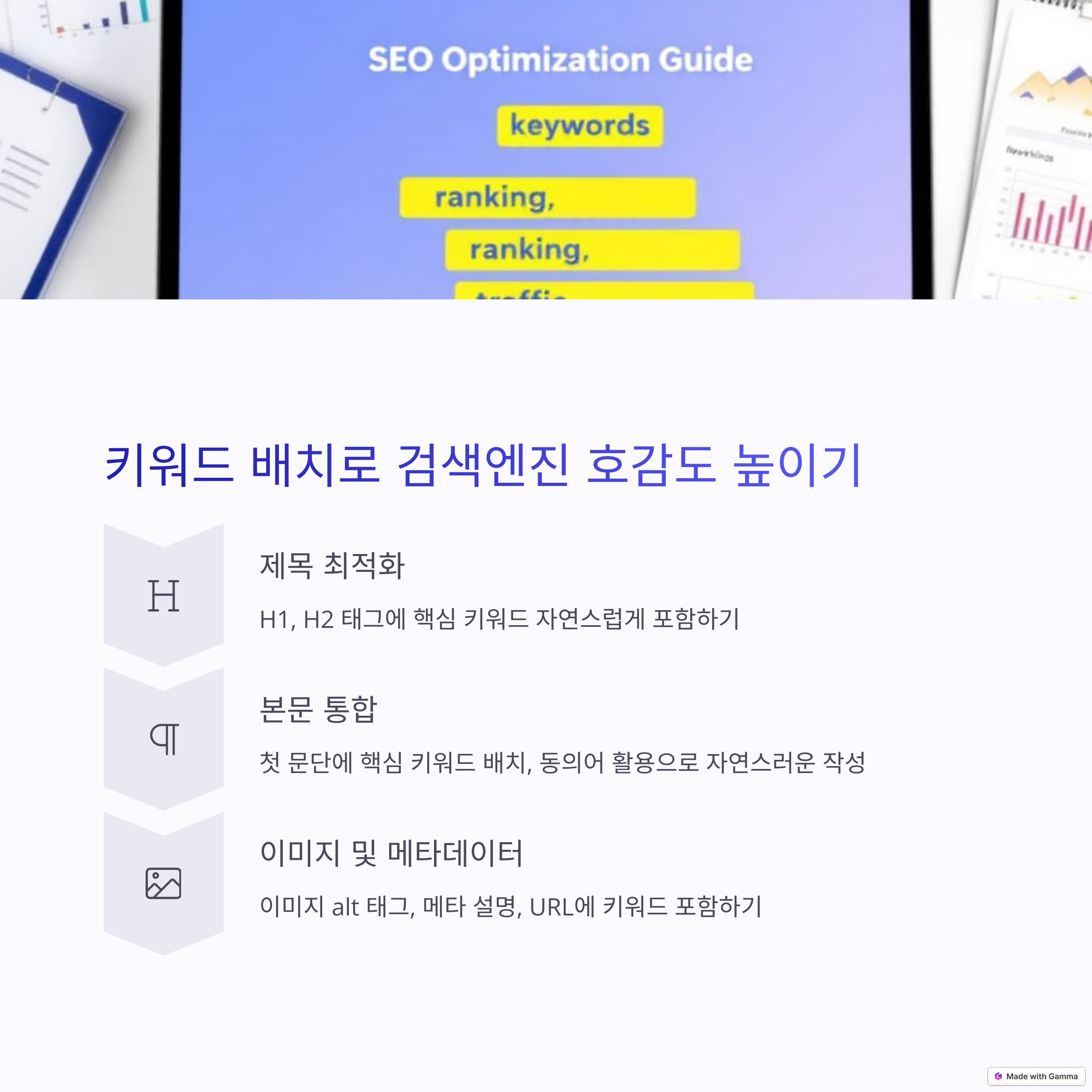 이미지 파일명을 업로드 전에 키워드로 지정하고, alt 속성에도 관련 키워드를 입력하세요. 이는 구글 이미지 검색에도 노출될 수 있게 도와줍니다. 예: filename="blog-seo-tips.jpg" alt="블로그 키워드 최적화"