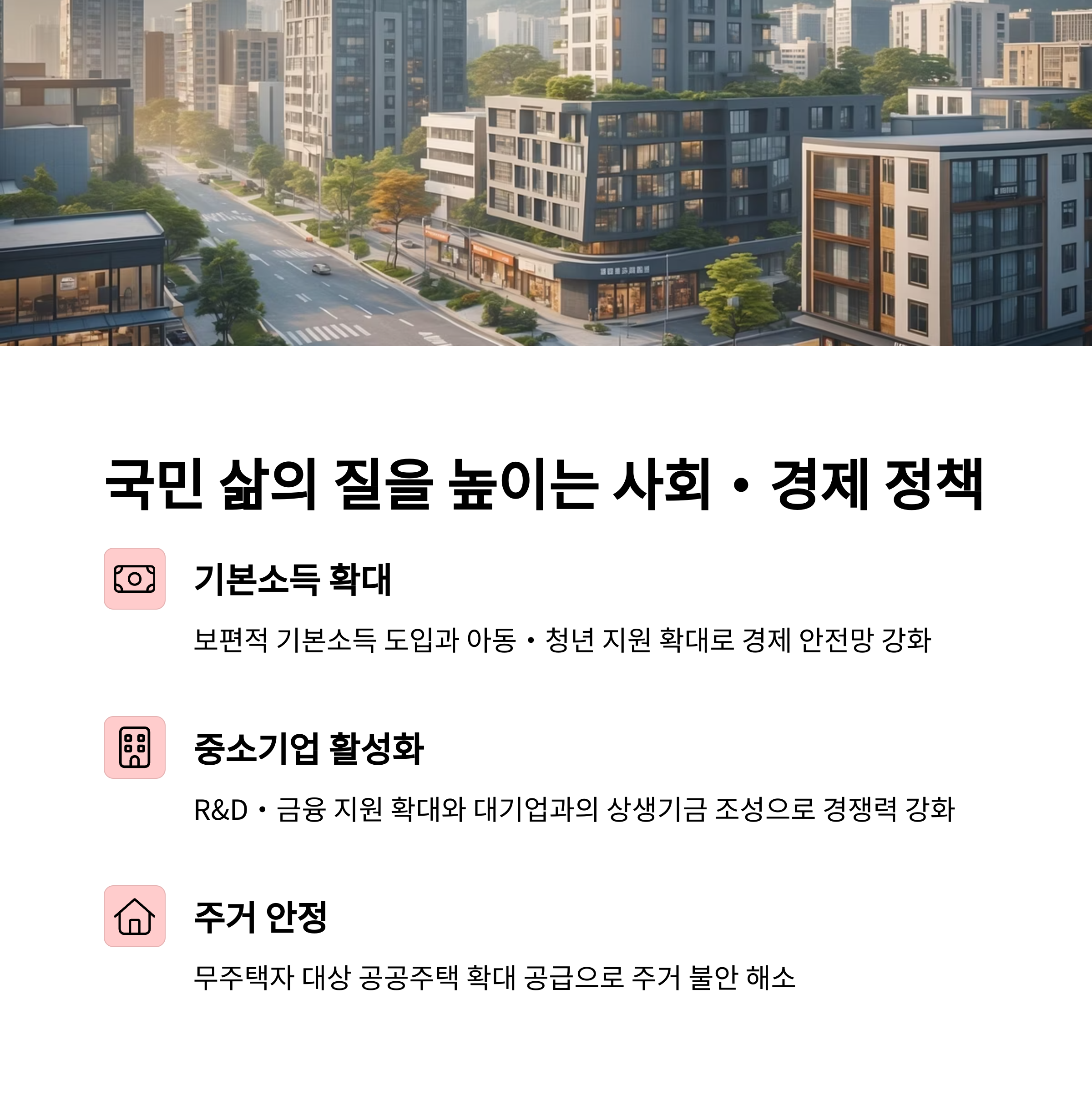 주거 문제 해결을 위해 공공임대주택 공급 확대와 부동산 시장 규제 강화가 핵심입니다. 이를 통해 주거비 부담을 줄이고, 서민과 청년층의 주거 안정성을 높일 계획입니다. 부동산 투기 억제와 실수요자 중심의 정책 실행도 중요한 과제입니다.