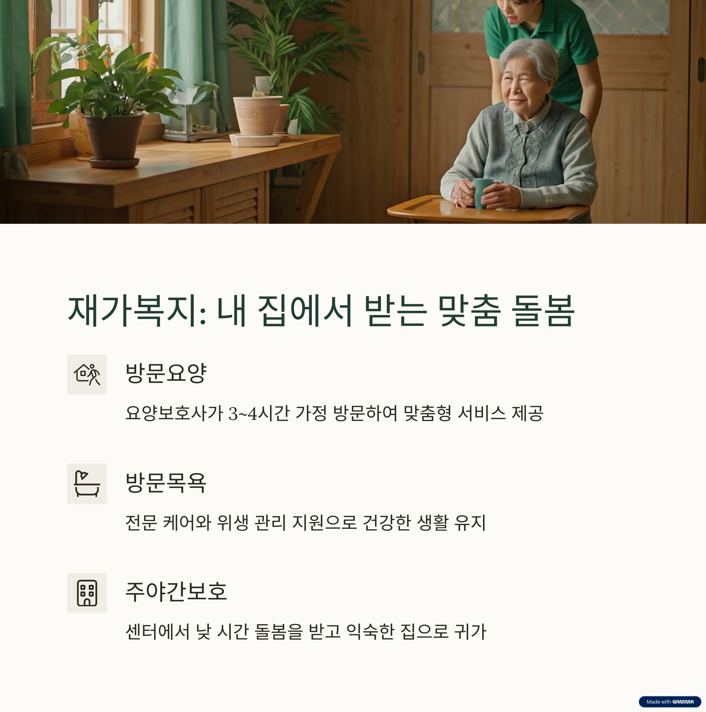 방문요양, 방문간호, 식사 배달, 주거환경 개선 등 다양한 서비스가 제공됩니다.