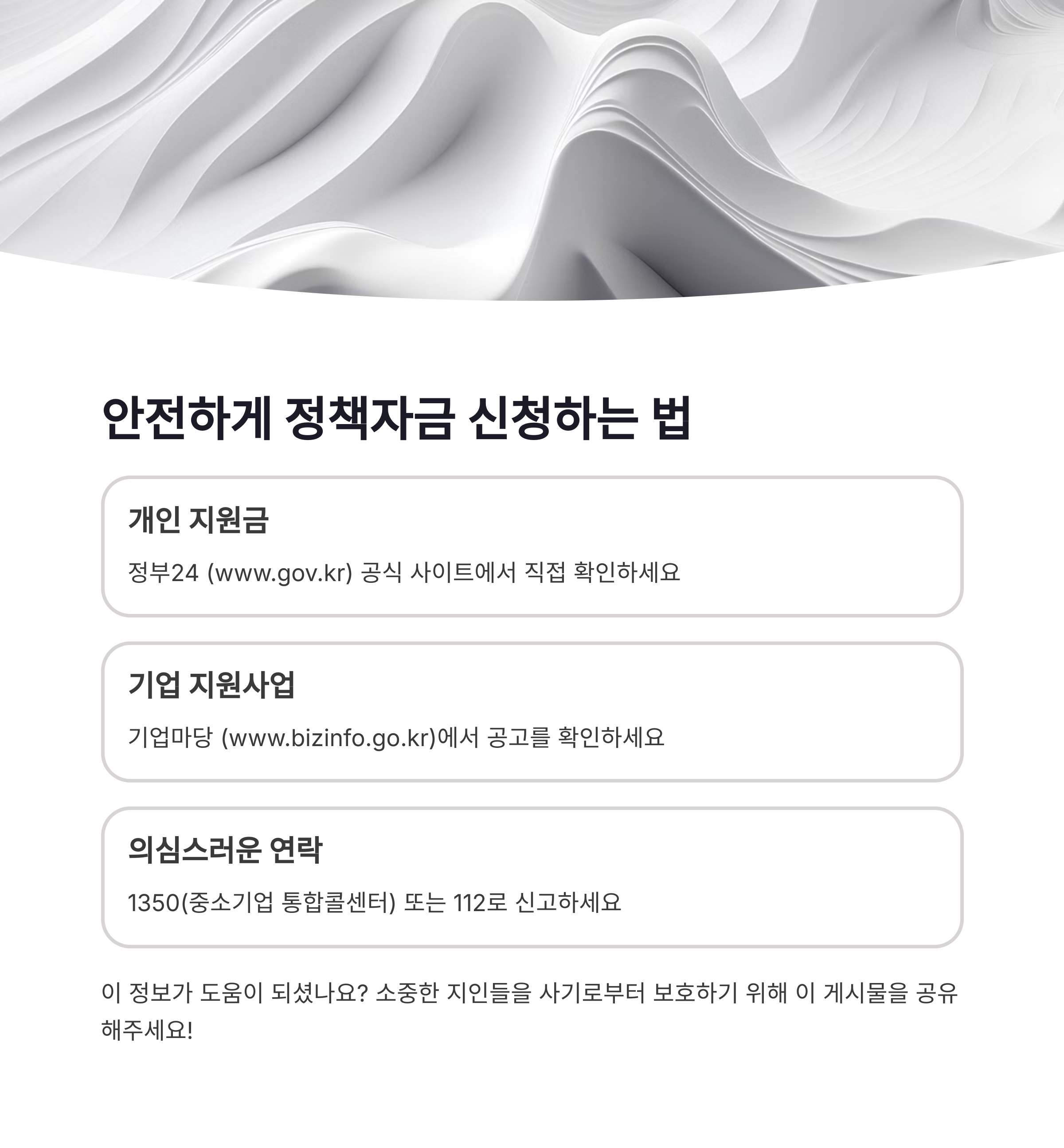 요즘처럼 지원금 정보가 넘쳐나는 시대일수록, 내 정보를 지키는 ‘검증 습관’이 정말 중요합니다. 공공기관 도메인인지, 수수료를 요구하지 않는지, 진짜 공고문이 있는지 반드시 확인하세요. 의심된다면 주변에 꼭 공유하시고, 이 글도 함께 전해 주세요. 피해는 줄이고 기회는 제대로 잡는 게 중요합니다!
