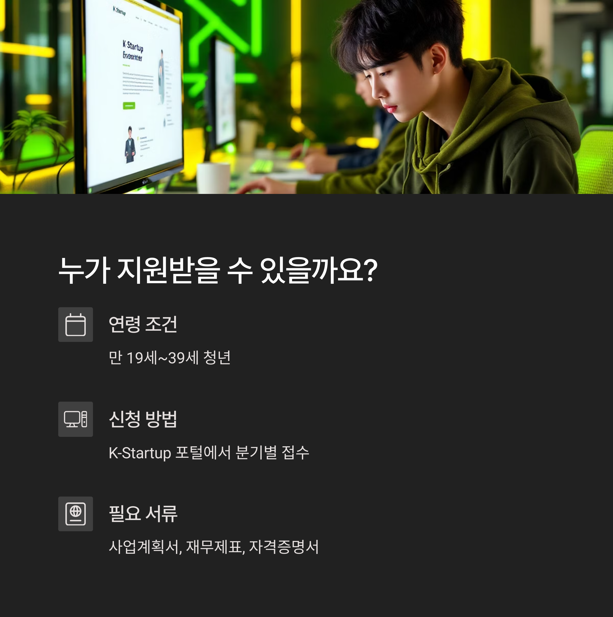 신청은 주로 K-Startup, 청년정책플랫폼, 지역 창조경제혁신센터에서 진행됩니다. 아래 팁 참고해 주세요: