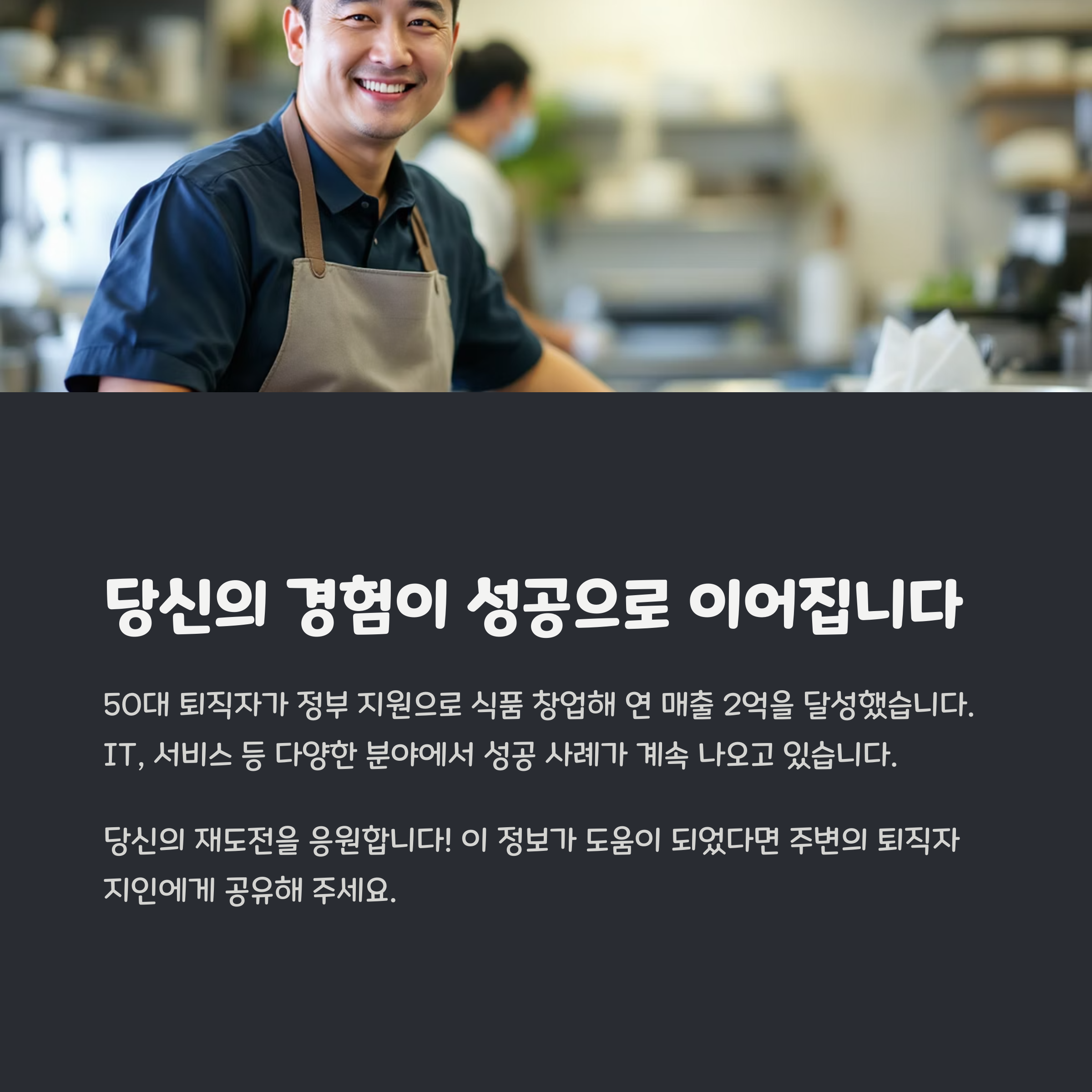 퇴직은 끝이 아니라 새로운 시작이에요. 특히 정부는 중장년의 경험을 활용한 창업을 장려하고 있어요. 저도 그 기회를 잡아 지금은 안정적으로 운영 중입니다. 여러분도 오늘 내용을 바탕으로 재도전의 발판을 마련해 보세요. 다음 글에서는 여성창업자에게 유리한 업종과 자금에 대해 다룰게요. 계속 따라오세요!