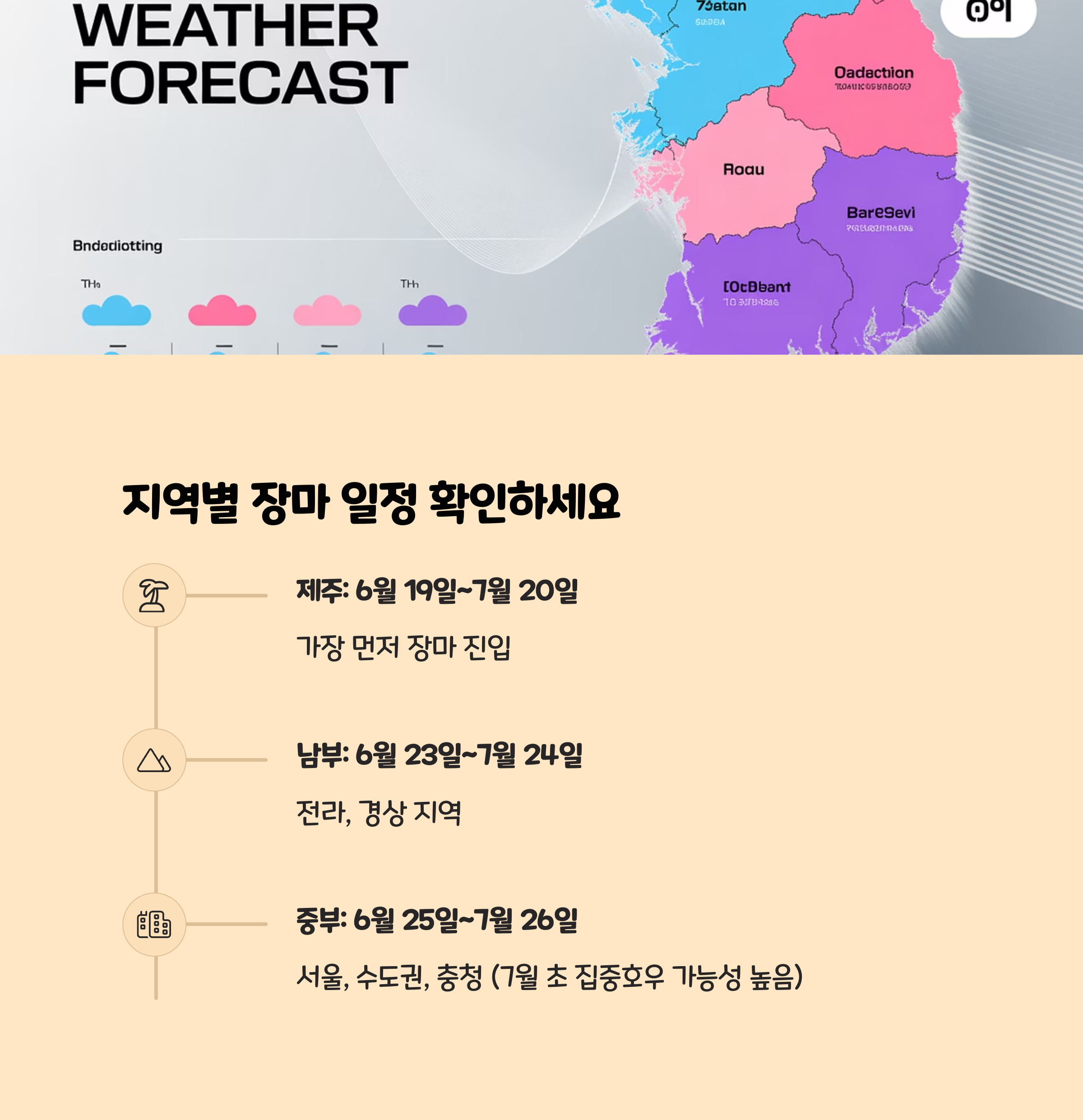지역별로 장마 시작 시기와 종료 시기에 차이가 있습니다. 일반적으로 제주도가 가장 먼저 장마에 진입하며, 이후 남부지방, 중부지방 순으로 장마가 시작됩니다. 아래는 지역별 장마 기간의 차이를 정리한 리스트입니다.